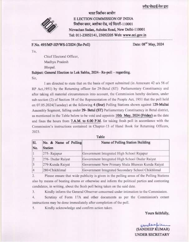 एमपी लोकसभा चुनाव : इस सीट में फिर होगा मतदान, चुनाव आयोग ने लिया बड़ा फैसला
