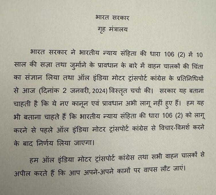 अखिल भारतीय परिवहन कांग्रेस की बैठक पर केंद्रीय गृह सचिव अजय भल्ला ने कहा, “हमने आज अखिल भारतीय परिवहन कांग्रेस के प्रतिनिधियों से चर्चा की. सरकार ये बताना चाहती है कि नए कानून और जुर्माने के प्रावधान अभी लागू नहीं हुए हैं. उन्होंने कहा, भारतीय न्याय संहिता की धारा 106(2) लागू करने से पहले अखिल भारतीय परिवहन कांग्रेस से विचार विमर्श किया जाएगा. ड्राइवरों और ट्रांसपोर्टर की चिंंताओं को सुनने के बाद ही अंति निर्णय लिया जाएगा।