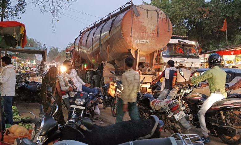 राजमार्ग पर दुकान और वाहन खड़े होने से यातायात प्रभावित
