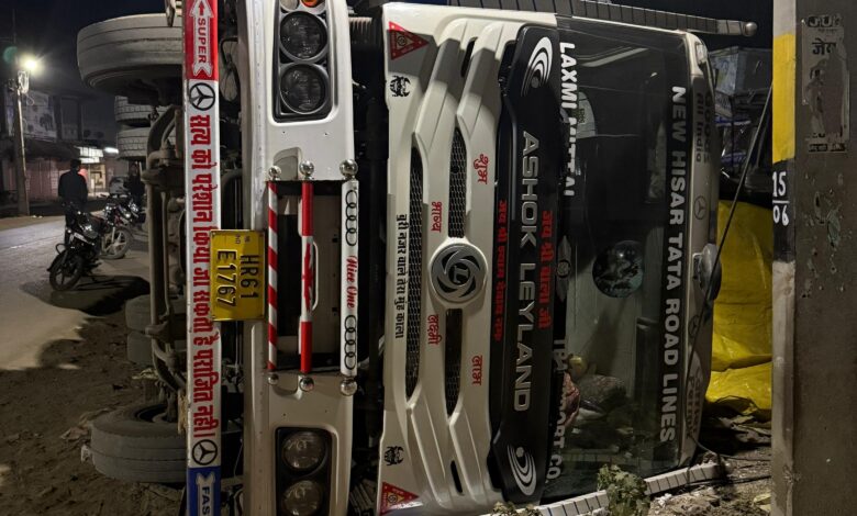 जानकारी के अनुसार बुधवार की रात्रि करीब 9 बजे धान से भरा ट्रक नंबर HR61 E 1767 स्टेट हाइवे 44 उदयपुरा मार्ग पर जाना था लेकिन गलती से चालक ट्रक को बरेली मार्ग पर ले गया, लेकिन गलती का अहसास होने चालक ने ट्रक मोड़ने के लिए उसे सड़क से नीचे उतारा लेकिन सड़क की ऊंचाई अधिक होने व साइड नीची होने से चालक ट्रक पर नियंत्रण नहीं रख सका इससे वह ट्रक सड़क किनारे खड़े एक अन्य ट्रक पर पलट गया। हालांकि इस हादसे में कोई हताहत नहीं हुआ लेकिन सड़क किनारे खड़ा ट्रक सामने से क्षतिग्रस्त हो गया।