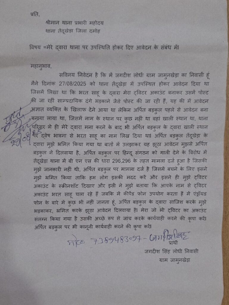 तेंदूखेड़ा । दमोह जिले से झूठी शिकायत करने के मामले लगातार सामने आते रहते हैं एक ऐसा ही मामला जिले के तेंदूखेड़ा थाने से आया है जहां पर जगदीश सिंह लोधी निवासी ग्राम जमुनाखेड़ा के द्वारा थाना तेंदूखेड़ा में उपस्थित होकर एक आवेदन देकर बताया गया है कि दिनांक 27 अगस्त 2025 को अर्पित बड़कुल के द्वारा मुझे भ्रमित करके गुमराह करके झूठी जानकारी देकर यह बताया गया कि आपका ट्विटर अकाउंट एक व्यक्ति चल रहा है अर्पित बड़कुल मुझे तेंदूखेड़ा थाना लेकर गया मैंने उससे बोला कि यह आवेदन अज्ञात व्यक्ति के खिलाफ देना है लेकिन अर्पित बड़कुल आवेदन पहले से बनाकर रखे हुए था और उस आवेदन में नाम की जगह पर खाली स्थान था जैसे ही आवेदन देने लगे तो अर्पित बड़कुल ने अज्ञात ना लिखकर वहां द्वेष पूर्ण भरत साहू का नाम लिख दिया मेरे मना करने के बाद भी अर्पित बड़कुल ने यह कृत्य किया, हफ्ते पहले हिंदू समाज को गाली देना के कारण अर्पित बड़कुल के खिलाफ तेंदूखेड़ा थाने में धारा 296, 299 के तहत मामला दर्ज हुआ है जिसकी जानकारी मुझे नहीं थी इस रिपोर्ट के बचाव में अर्पित बड़कुल के द्वारा यह साजिश करके झूठा आवेदन दिलवाया गया है अर्पित बड़कुल के द्वारा ही मुझे ट्विटर अकाउंट के स्क्रीनशॉट दिखाए गए थे मैं कीपैड फोन उपयोग करता हूं मैं एंड्रॉयड फोन के बारे में कुछ भी नहीं जानता हूं मुझे अर्पित बड़कुल के द्वारा ही बहलाया, फुसलाया गया और गुमराह करके तेंदूखेड़ा थाने में भरत साहू के खिलाफ द्वेष भावना रखते हुए आवेदन दिलवाया गया ऐसे साजिश करके झूठे आवेदन देने वाले अर्पित बड़कुल के खिलाफ मैं थाना मेंने उपस्थित होकर कानूनी कार्यवाही की मांग की है ताकि भविष्य में यह इस प्रकार की हरकत किसी के भी साथ ना कर सकें।