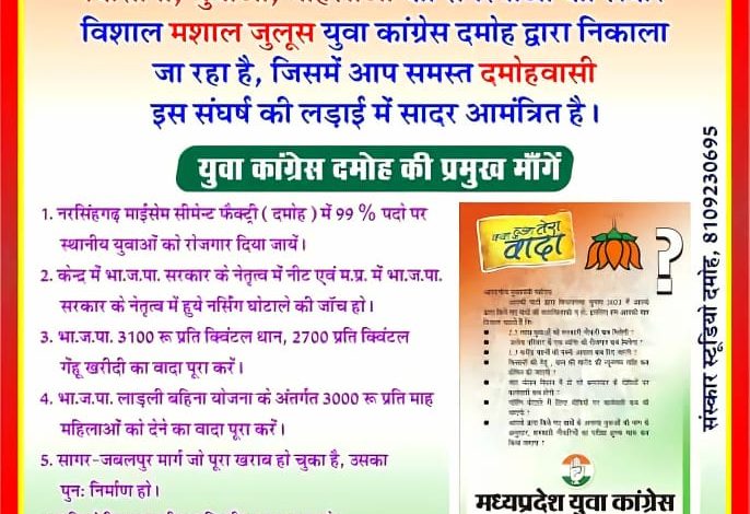 दमोह। किसानों युवाओं महिलाओं केन्द्र में भाजपा सरकार के नेतृत्व में हुई नीट परीक्षा घोटाला म.प्र. सरकार में हुए नर्सिंग घोटाले की जांच को लेकर 19 जुलाई 2024 शुक्रवार को युवा कांग्रेस द्वारा जो मशाल जुलुस जटाशंकर तिराहा से निकाला जा रहा है। उसमें जिला कांग्रेस कमेटी से किसी भी प्रकार की सहमति नहीं ली गई है साथ ही कांग्रेस में कोई भी मोर्चा संगठन प्रकोष्ठ सम्मिलित नहीं होगे।