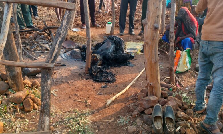 मृतक का शरीर खेत में उल्टे बैठे हुए जलाया दिख रहा है।