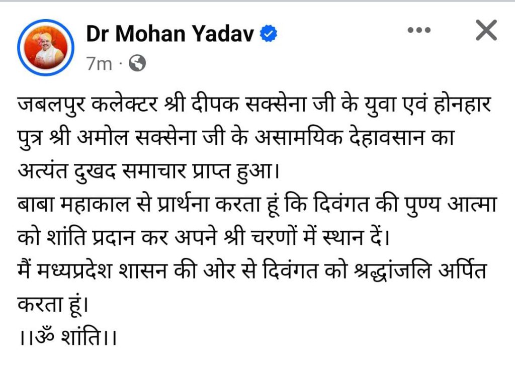 जबलपुर कलेक्टर दीपक सक्सेना को पुत्र शोक