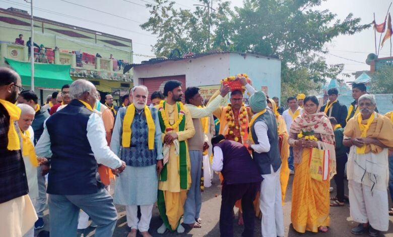 बेगमगंज । हर वर्ष की भांति इस वर्ष भी श्री राम कथा समिति द्वारा संगीतमय श्रीमद् भागवत कथा ज्ञानयज्ञ का आयोजन किया जा रहा है श्रीमद्भागवत कथा के उपलक्ष्य में रविवार सुबह 10 बजे नगर के दशहरा मैदान मंदिर से कलश शोभा यात्रा का आयोजन किया गया जिसका जगह-जगह फूल बरसाकर स्वागत किया गया। कलश यात्रा मुख्य मुख्य मार्गो से होती हुई कथा स्थल जहां पर पहुंची मुखिया अजमान अपने सिर पर श्रीमद् भागवत लेकर चल रहे थे कई स्थानों पर लोगों ने आरती उतारी।