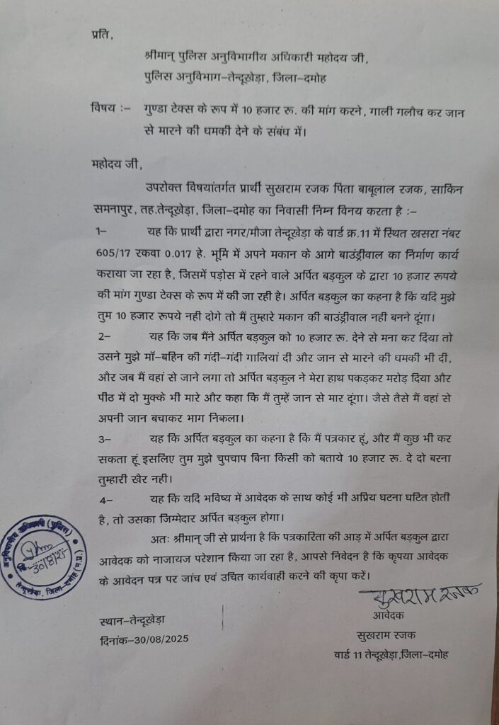 तेंदूखेड़ा । दमोह जिले के तेंदूखेड़ा से लगातार दबंगई के मामले सामने आ रहे हैं एक ऐसा ही मामला तेंदूखेड़ा के वार्ड क्रमांक 11 से सामने आया है जहां पर रहने वाले सुखराम रजक के द्वारा अपने घर के सामने बाउंड्रीवॉल बनाई जा रही है पड़ोस में रहने वाले अर्पित बड़कुल के द्वारा बाउंड्री वॉल बनाने की एवज में गुंडा टैक्स के रूप में ₹10000 की मांग की जा रही है और गाली गलोंच कर जान से मारने की धमकी भी दी जा रही है सुखराम रजक ने पैसे देने से मना किया तो अर्पित बड़कुल ने सुखराम रजक के साथ गाली-गलौज की और जब वहां से सुखराम रजक जाने लगे तो पीछे से हाथ पकड़ कर अर्पित बड़कुल ने सुखराम रजक का हाथ मरोड़ दिया और पीठ में तीन मुक्के भी मारे जैसे तैसे सुखराम रजक वहां से जान बचाकर भागे। उसके बाद सुखराम रजक ने एसडीओपी तेंदूखेड़ा को एक लिखित आवेदन देकर अर्पित बड़कुल के खिलाफ मामला दर्ज कराने की गुहार लगाई है। वहीं तेंदूखेड़ा थाना प्रभारी को भी एक आवेदन देकर रिपोर्ट दर्ज करने की मांग की है।