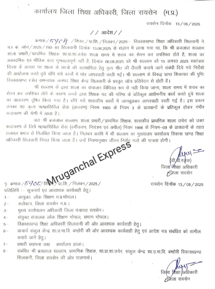 कलेक्टर द्वारा कराई गई जांच रिपोर्ट में शिक्षक के खिलाफ आरोप सही पाए जाने पर शिक्षक को तत्काल प्रभाव से निलंबित कर मुख्यालय सिलवानी विकासखंड शिक्षा अधिकारी कार्यालय सिलवानी नियत किया गया है।