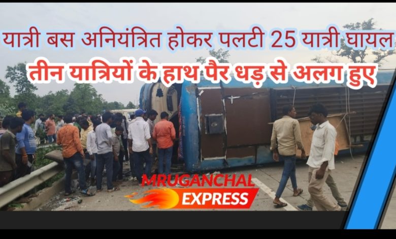 यात्री बस अनियंत्रित होकर पलटी 25 यात्री घायल, तीन यात्रियों के हाथ पैर धड़ से अलग हुए