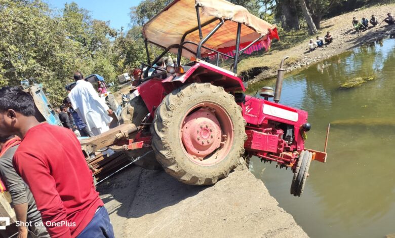 बिना रेलिंग पुल पर ट्रैक्टर लटका, दो बच्चे नदी में गिरे, आई चोट