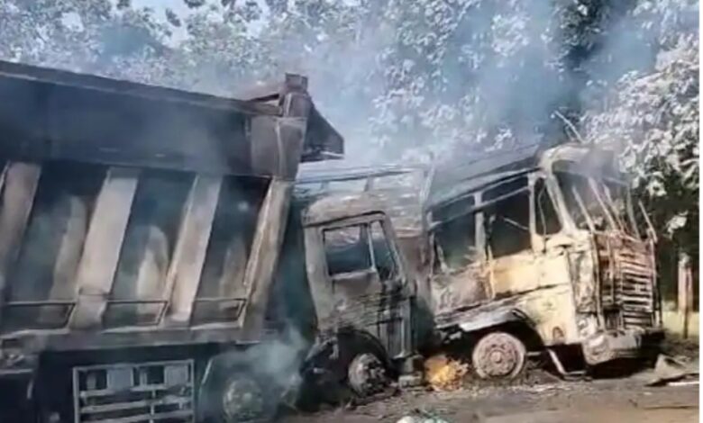 दोनों ट्रकों के टकराने के बाद ट्रकों में लगी भीषण आग।